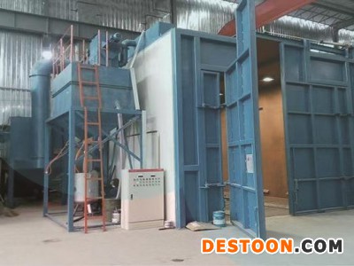 机械回收型喷砂房主要包括方体部分,漏斗格栅,丸料循环回收系统(包括皮带输送机或螺旋输送器,提升机,分离器,储料仓,回转加料阀),除尘系统,承载系统,照明系统,电器控制系统,三维升降平台等。